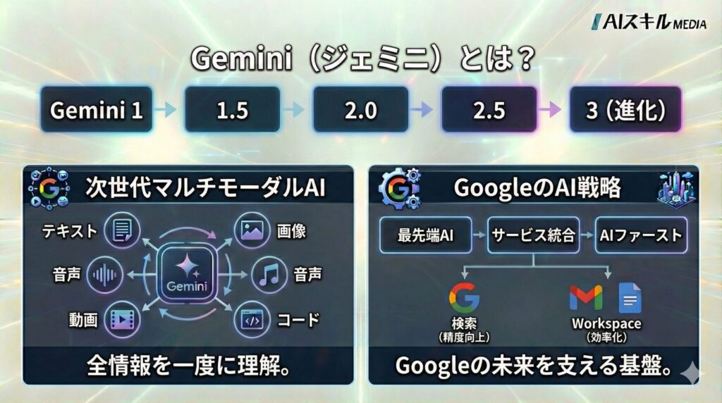 ここではまず、Geminiの基本情報と、開発背景にあるGoogleの戦略について解説します。