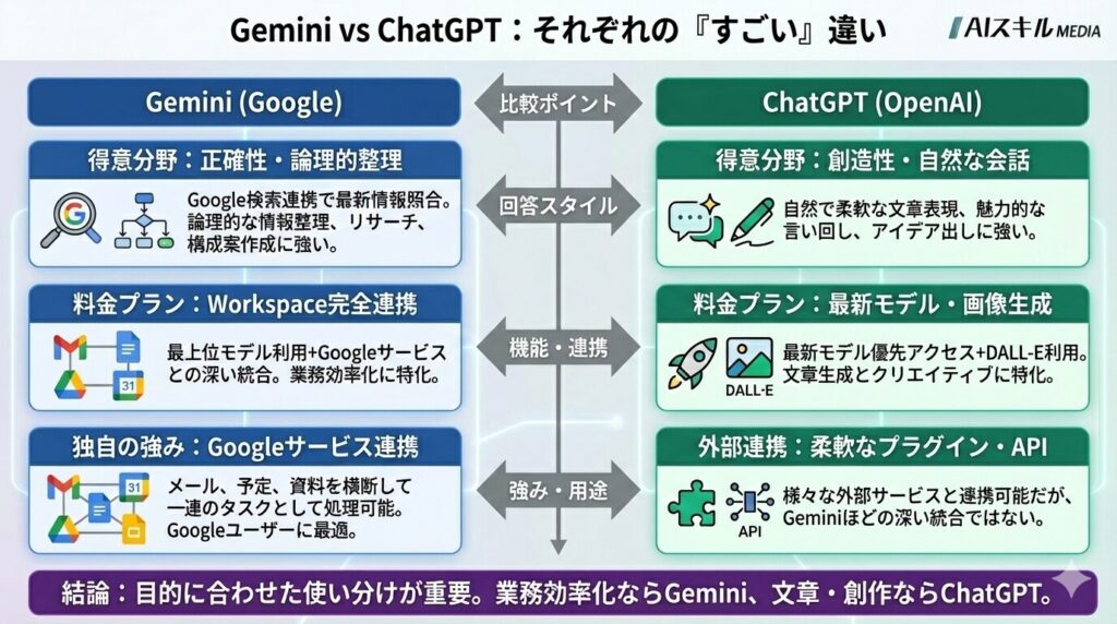 一方Geminiは、Google検索と連携した最新情報照合や論理的な情報整理を得意としており、正確性を重視するタスクで「すごい」と感じられる傾向があります。