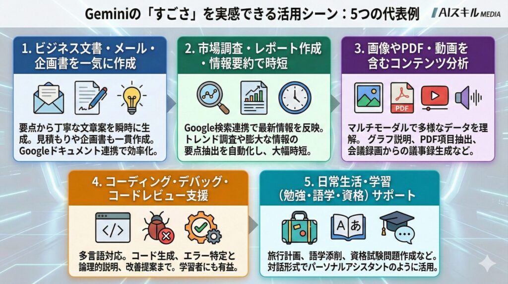 ここでは、Geminiの「すごい」を実感できる代表的な5つの活用シーンを解説します。
